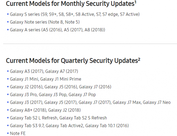 갤럭시 S6 시리즈는 월 업데이트 리스트에 포함되었으나 오늘 발표된 리스트에는 제외되었다. 아래는 월 업데이트를 받는 기기들과 분기 업데이트를 받는 기기들의 리스트이다.